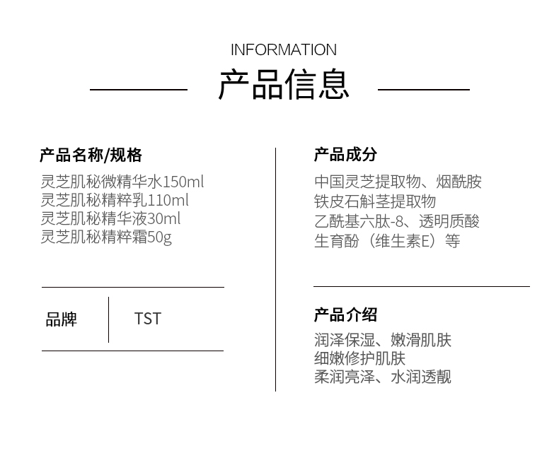 TST灵芝肌秘微精华水150ml+TST灵芝肌秘精粹乳110ml+TST灵芝肌秘精华液30ml+TST灵芝肌秘精粹霜50g 赠送:赋活美肌胶原液40ml*2+精致水晶手串+TST灵芝肌秘微精华水三联包*2+TST灵芝肌秘大礼盒