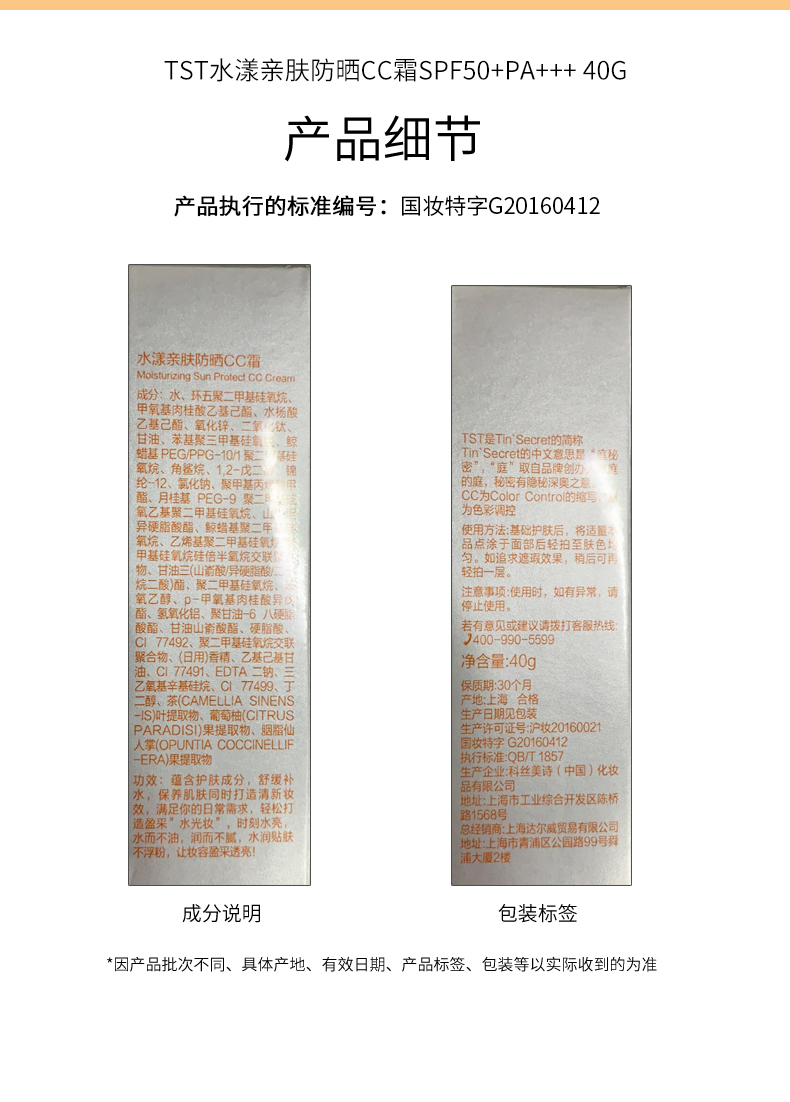 TST水漾亲肤防晒CC霜SPF50+PA+++40g*2 赠送:TST水漾亲肤防晒CC霜SPF50+PA+++40g