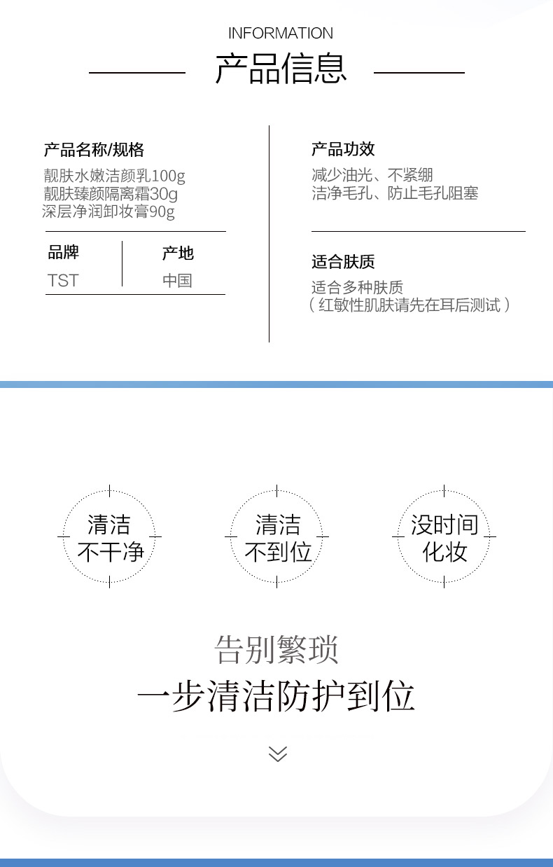 深层净润卸妆膏90g+TST靓肤水嫩洁颜乳100g+靓肤臻颜隔离霜30g 赠送:黑头铲+靓肤臻颜隔离霜5g +靓肤水嫩洁面乳(10g)+深层净润卸妆膏8g+TST靓肤水嫩洁水乳三联包*2