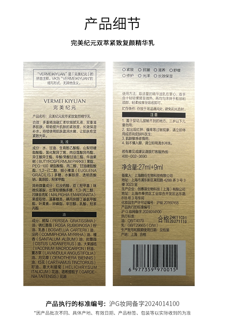完美纪元 双萃紧致复颜精华乳(27ml+9ml)*2 赠送:完美纪元御时智研充盈眼霜3g+完美纪元乳糖酸焕颜清肌面膜25ml*1+完美纪元 双萃紧致复颜精华乳(0.5ml+1.5ml)*2